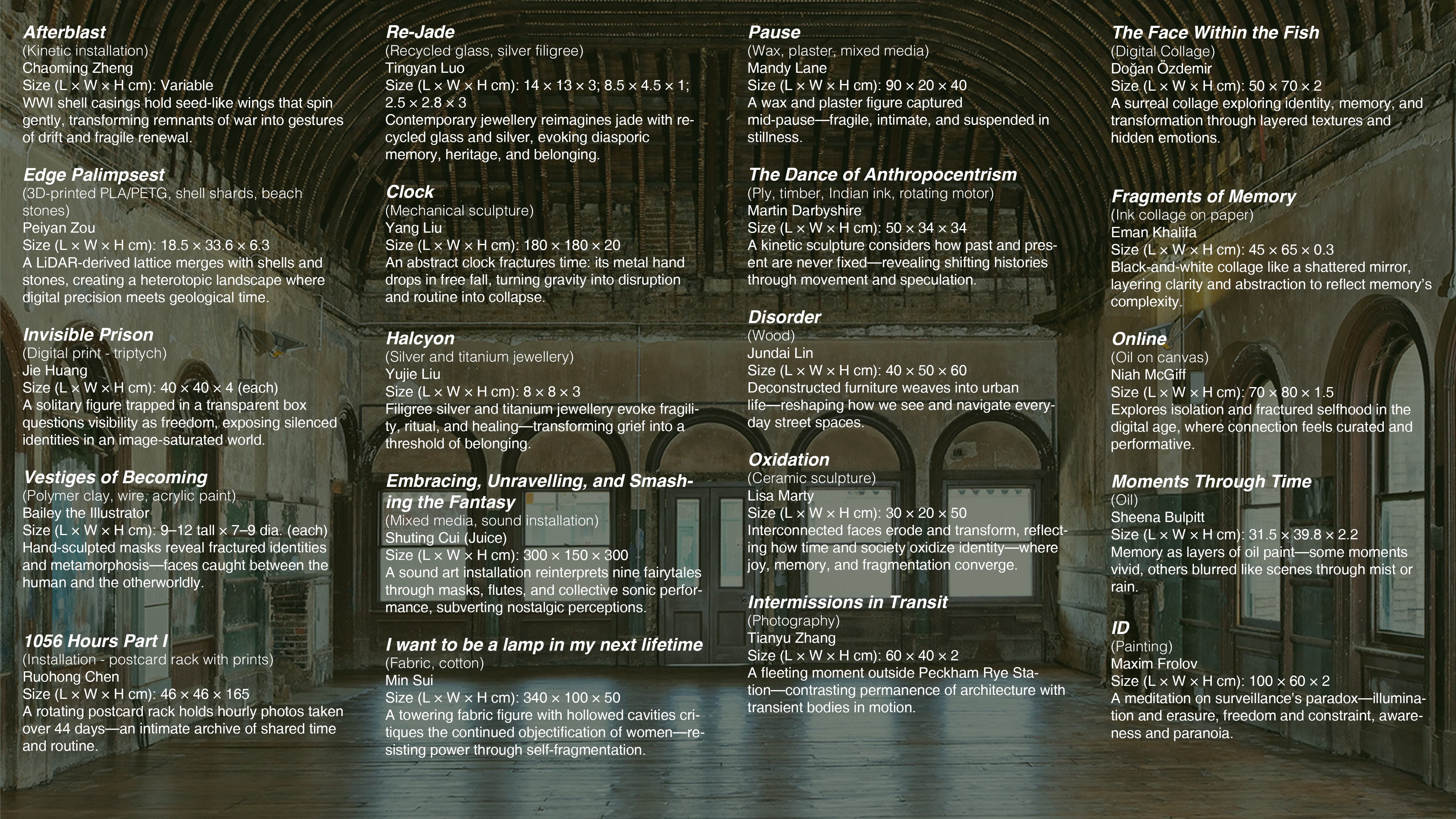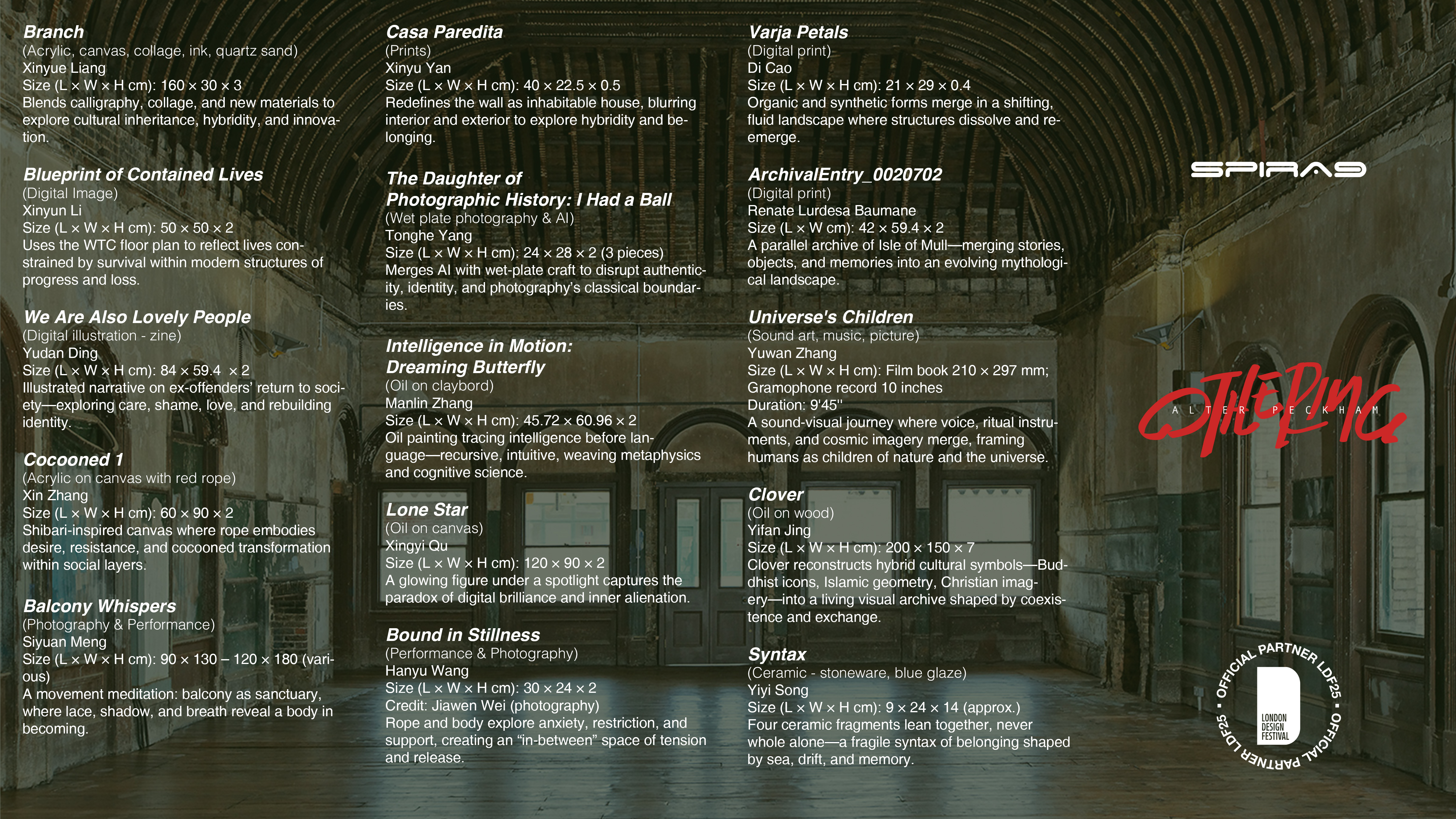 With Everything Then is Now – Alter Peckham, SPIRA9 launches its nomadic series Othering by staging a week-long curatorial intervention in one of South London’s most elusive architectural spaces. The Old Waiting Room at Peckham Rye Station, a Victorian relic sealed for over half a century, was famously reanimated in 2023 through Sarah Sze’s Metronome. Here, SPIRA9 takes the baton, not to restore or occupy the space, but to inhabit its liminality: the space between what was and what is yet to come. Peckham, where histories, geographies, and identities converge, is the ideal site for an exhibition exploring the cyclical, shifting nature of belonging. Over seven days, interdisciplinary artists respond to thresholds of form, discipline, and identity through site-specific works that dissolve temporal boundaries. The space becomes a mutable realm of “otherness.” The project’s title signals its conceptual underpinning: that the past is not fixed but constantly re-emerging in the present, and that “Othering,” so often framed as exclusion, can instead be a generative act. Here, difference becomes a site of connection and hybridization, resisting closure in favour of coexisting narratives. In this formulation, the “Other” is not feared but embraced as an agent of transformation. What emerges is less an exhibition than a collective experiment in spatial imagination. The Old Waiting Room, its grandeur weathered, its walls inscribed with dormant histories, becomes a living canvas. Works pulse against the room’s Victorian bones, their material and performative gestures refracting the space’s suspended temporality. Visitors navigate an environment in which memory, corporeality, and self are not stable entities but interwoven forces. "Everything Then is Now" carries a meta-architectural weight. As the Old Waiting Room nears its transformation into a permanent cultural venue, SPIRA9’s activation acts as both prelude and provocation. In collaboration with London Design Festival and public institutions, the curators assert art’s role in shaping how we re-enter and reimagine historic spaces. The exhibition’s final line lands not as a slogan but as a curatorial ethos, looping time, identity, and memory. Everything Fades to Begin, Everything Lost is Found, Everything Else is Here; Everything Cycles to End, Everything Old is New, Everything Then is Now. Invited Artists: 1e-43 | Angelo Bartolome | Ariel Li & Peifeng Cai | Asia Nowicki | Bailey The Illustrator | Canbin Liu | Chaoming Zheng | Daria Koshkina | DI CAO | Doğan Özdemir | Elizaveta Berkutova | Eman Khalifa | Eva Alliner | Hanyu Wang | Jie Huang | Junying Jiang | Jundai Lin | Lexiong Ying | Lisa Marty | Louis Loveless | Mandy Lane | Manlin Zhang | Maksim Frolov | Martin Darbyshire | Mathijs Hunfeld | Meng Li | Min Sui | Niah McGiff | Nuo Yang | Peiyan Zou | Po-Chien Huang | Qianru Yang | Renate Lurdesa Baumane | Ruohong Chen | Sheena Bulpitt | Shuting Cui (Juice) | Siyuan Meng | Tingyan Luo | Tianyu Zhang | Tonghe Yang | Xin Zhang | Xingyi Qu | Xinyun Li | Xinyu Yan | Xinyue Liang | Yalu Zhao | Yang Liu | Yifan Jing | Yi Ming Zhang | Yiyi Song | Yixin Wang | Yudan Ding (Yuna) | Yujie Liu | Yuwan Zhang Opening Night: 16 Sept. | 18:00 – 21:00 General Admissions: 17-21 Sept.| 12:00 – 19:00 · A Song of the Blues – Eva Allinder Performers: Aisling Gallagher | Niamh Gallagher | Lucy Havelock | Ao Shen Opening Night Performance: · Until Nothing Remains Visual & Performance: Performance Director/Choreographer/Dancer: James Shing Mu Cheng | Choreographer/Dancer: Siqi Chen Sound: Live Electronics: Juice | Cellist: Santi Lowe · Balcony Whispers – Siyuan Meng Director: Siyuan Meng | Performer: Azize Sousami | Composer: Christopher Rodriguez Curator: Kaycee | Creative Director: Teng Xue | Curatorial Assistant: Jingqi Chen, Hanyu Wang, Spencer Yu | Exhibition Designer: Daniel Foster | Technical Producer: James O’Connor | Photographer: Yilu Tang, Han Wang