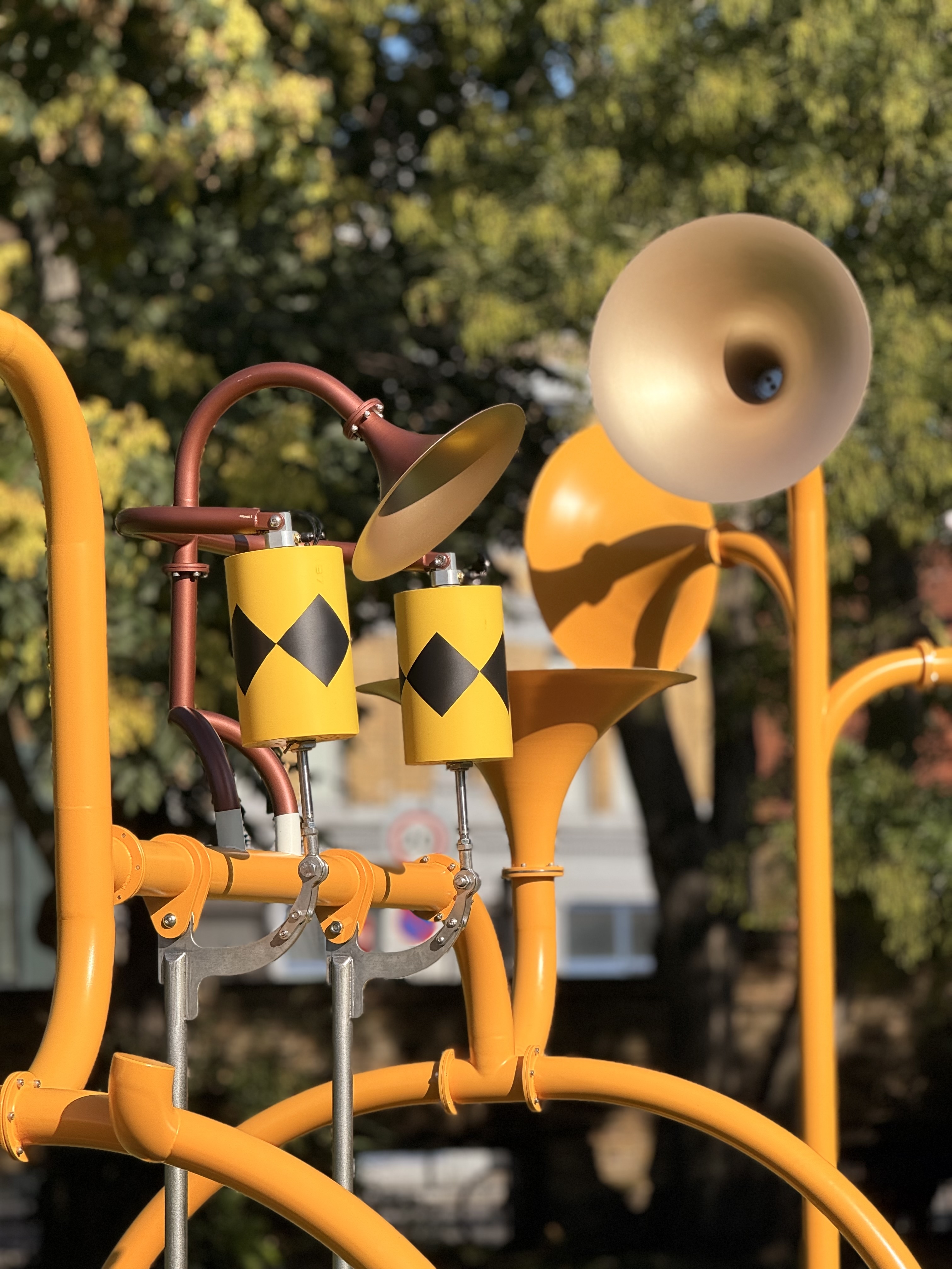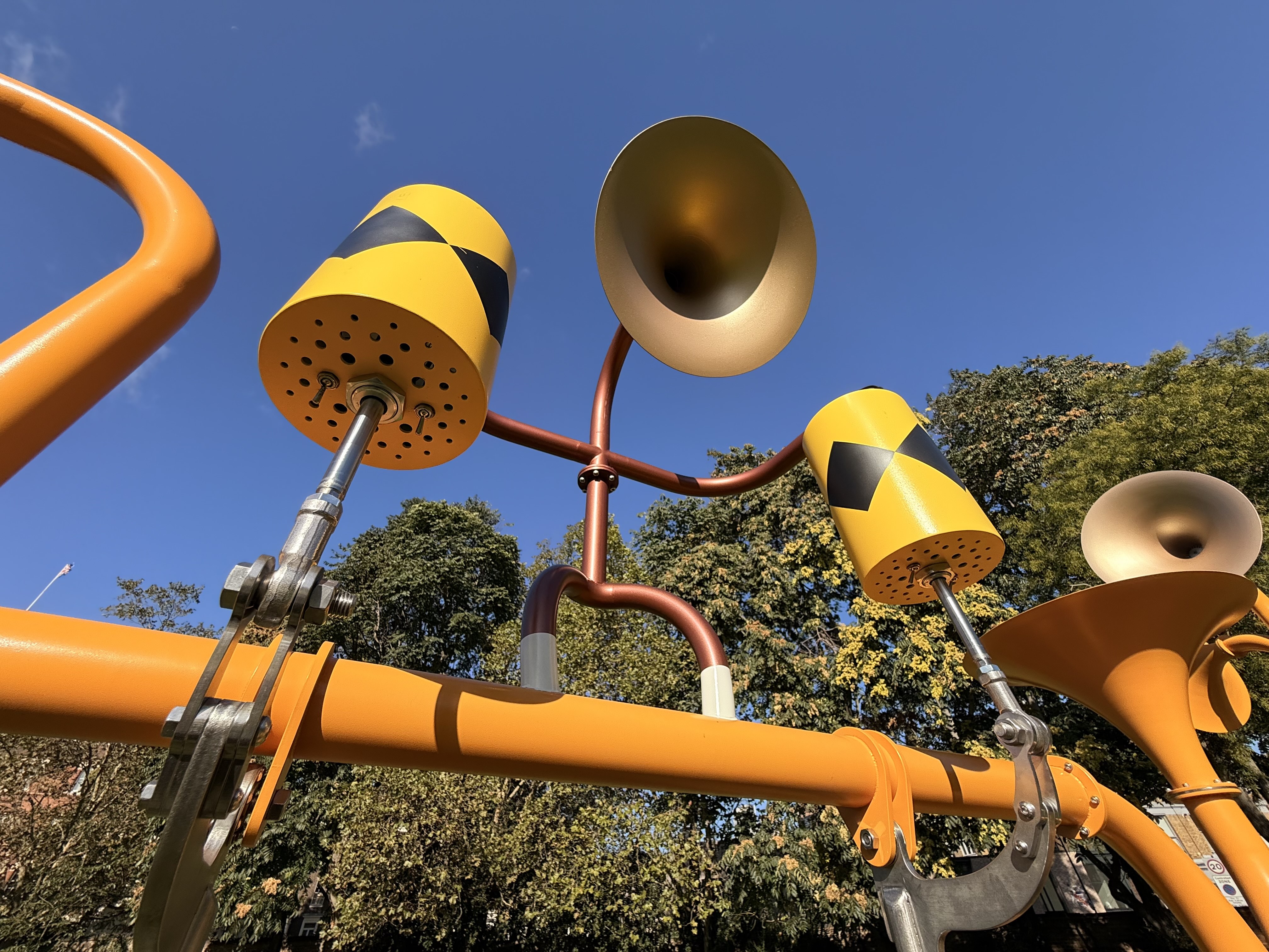 Hornscape Playground is an interactive public art installation that transforms a playground into a musical landscape. Crafted from polished stainless steel and bright yellow tubing, the work features horn-shaped forms integrated with swings and hand-operated mechanisms, inviting participation from children and adults alike. When in use, the swing activates internal pneumatic devices that emit horn-like sounds—reminiscent of elephant trumpets—without any need for electricity. This not only encourages playful human-powered engagement but also promotes sustainability. By combining motion, sound, and design, Hornscape Playground reimagines the park as a stage for collective creativity. Project sponsored by TAIWAN CONTENT PLAN.