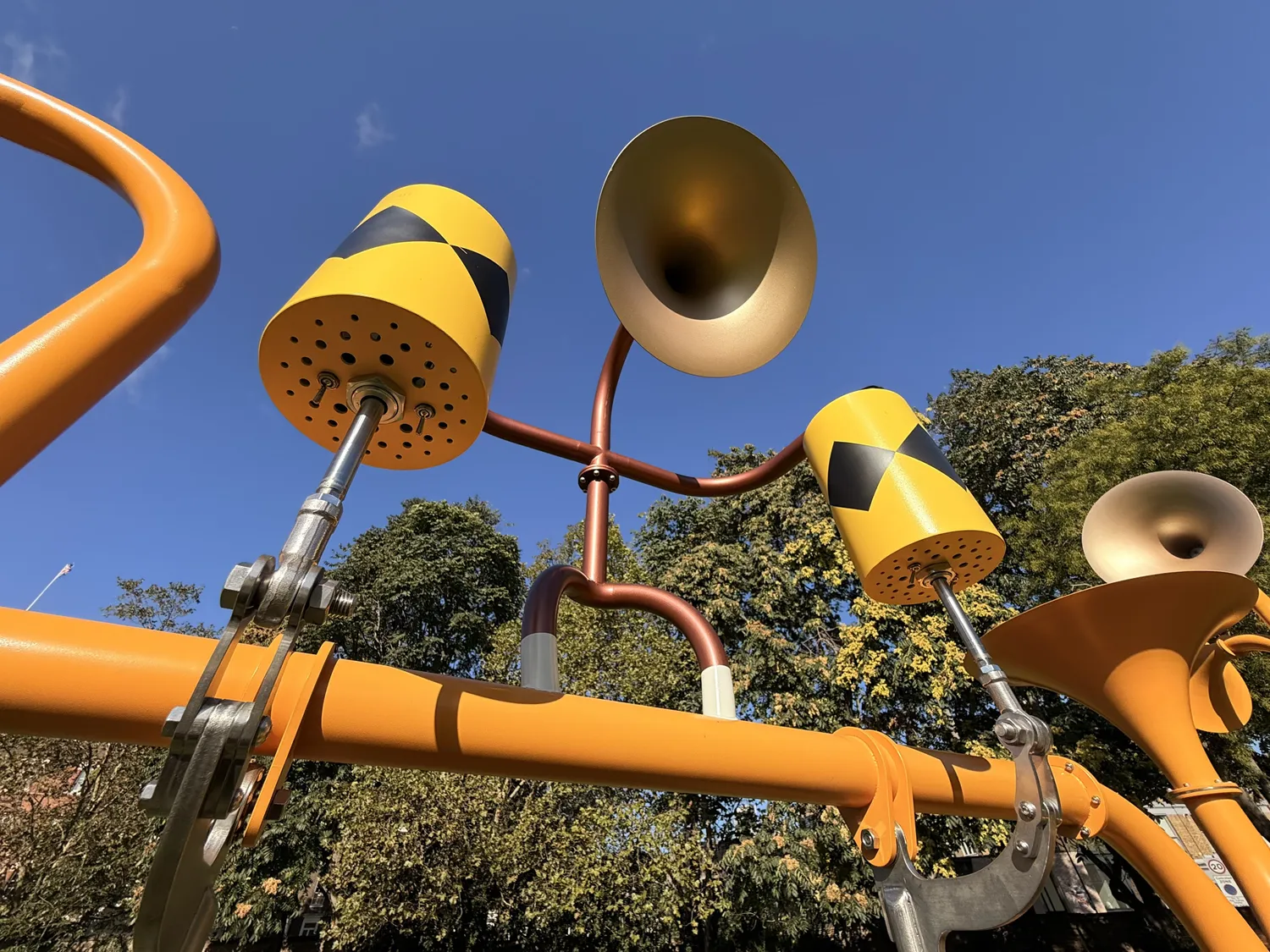 Hornscape Playground brings these ideas into a public realm, combining sound, form, and swinging motion in a shared outdoor environment. ‘Traditional playgrounds focus on physical activity, with sound as an incidental byproduct,’ he explains. Here, sound is at the centre.